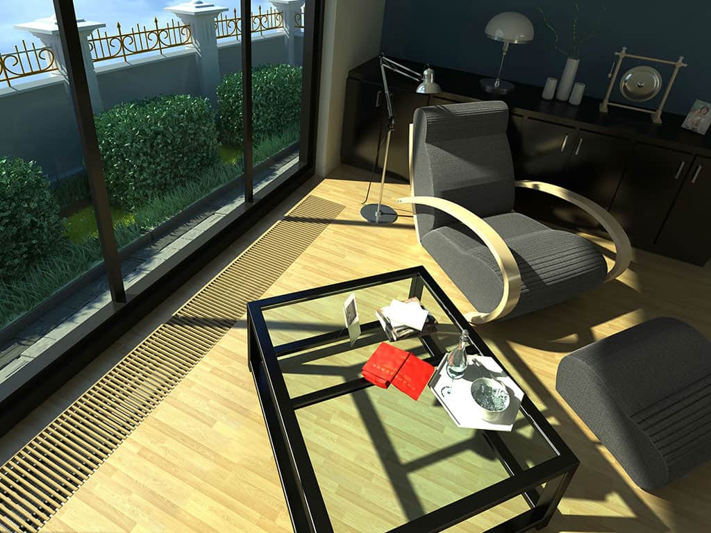 The Hitte Fan-Assisted Trench Heating is an effective space heating system either as a powerful yet discrete primary heating system, or, as a fast acting secondary heating system perfect for counteracting downdraught or condensation in highly glazed areas. It operates using piped hot water (LPHW) as the heat source which can be supplied from a conventional hot water boiler, solar energy hot water system or a ground source heat pump.